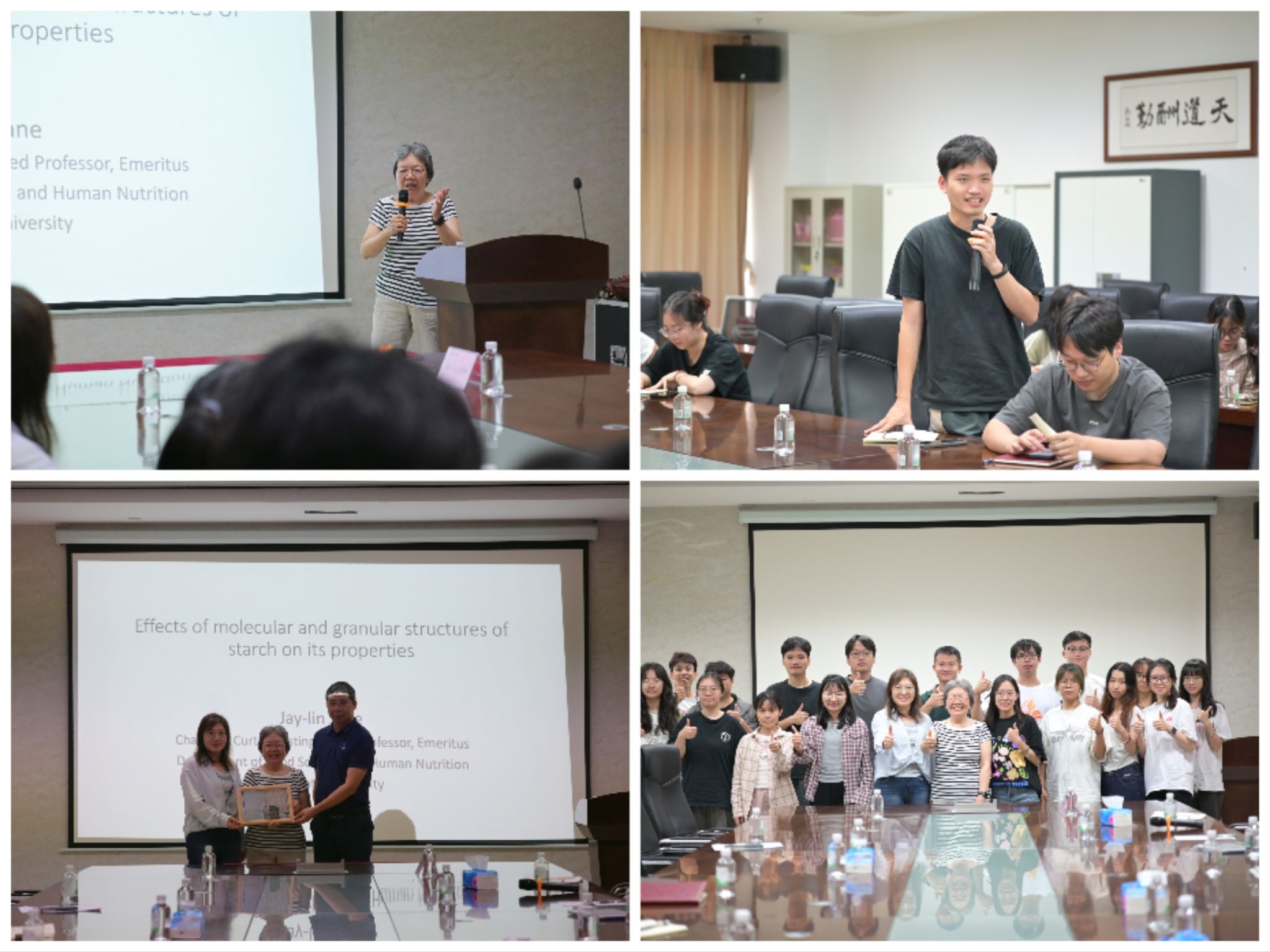 报告会上,Jane教授以《淀粉分子和颗粒结构对性质的影响》为题,系统介绍了淀粉科学的基础和前沿研究进展。报告不仅涵盖了淀粉精细结构、性质表征等基础理论知识,更融入了Jane教授在淀粉改性与应用领域的宝贵经验,为在场师生呈现了一场理论与应用并重的学术盛宴。在互动环节,师生们围绕淀粉的酶解机制优化、交联改性技术创新以及清洁标签淀粉生产工艺等热点问题,与Jane教授展开了深入交流,现场学术氛围浓厚,讨论热烈。报告会后,谢炯标代表学院向Jane教授赠送了纪念品,全体参会人员合影留念。