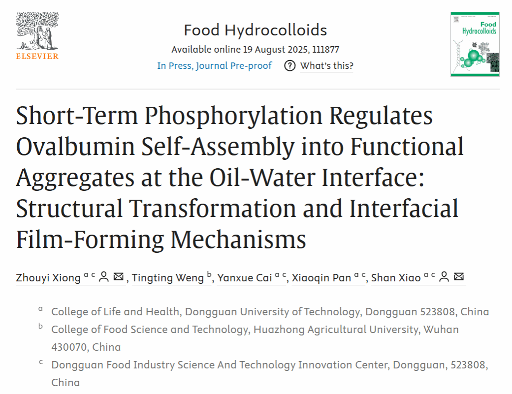 2025年8月,sunbet申博肖珊教授团队于国际食品顶级期刊《Food Hydrocolloids》(IF = 12.4)在线发表题为“Short-Term Phosphorylation Regulates Ovalbumin Self-Assembly into Functional Aggregates at the Oil-Water Interface: Structural Transformation and Interfacial Film-Forming Mechanisms”的研究性文章。论文第一作者为熊舟翼特聘副研究员,共同通讯作者为肖珊教授。