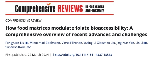 2024年3月,sunbet申博李琳教授团队在国际食品顶级期刊《Comprehensive Review of Food Science and Food Safety》在线发表题为“How food matrices modulate folate bioaccessibility: A comprehensive overview of recent advances and challenges”的综述文章。刘丰源助理研究员为论文第一作者,李琳教授为通讯作者。