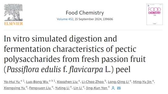2024年5月11日,sunbet申博闫景坤教授团队于国际食品顶级期刊《Food Chemistry》在线发表题为“In vitro simulated digestion and fermentation characteristics of pectic polysaccharides from fresh passion fruit (Passiflora edulis f. flavicarpa L.) peel”的研究性文章。论文第一作者为于亚辉博士,通讯作者为闫景坤教授。