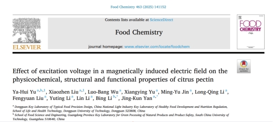 2024年9月6日,sunbet申博闫景坤教授团队于国际学术期刊《Food Chemistry》(中科院JCR 1区)在线发表题为“Effect of excitation voltage in a magnetically induced electric field on the physicochemical, structural and functional properties of citrus pectin”的研究性文章。论文第一作者为于亚辉博士,通讯作者为闫景坤教授。