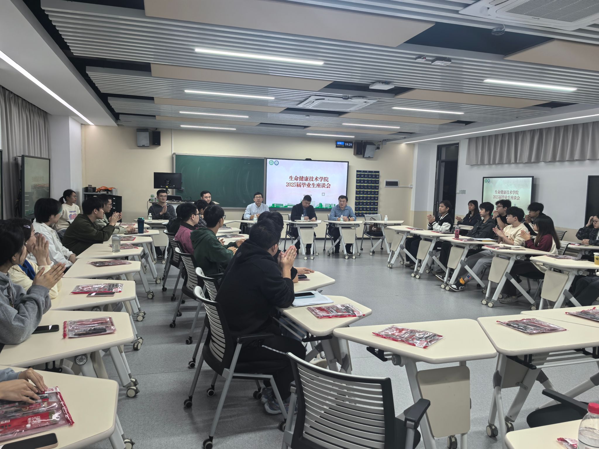 座谈会上,各位毕业生围绕当前毕业设计开展情况、就业状况、求职经历以及就业期望等方面进行交流。与会老师针对学生提出的关于毕业设计进度及答辩安排、就业政策、简历优化与面试技巧、考研考公等方面问题逐一进行了分析解答,建议同学们加强与指导老师沟通,合理安排毕业设计进度,并结合自身情况合理设定就业期望,尽早确定就业方向。